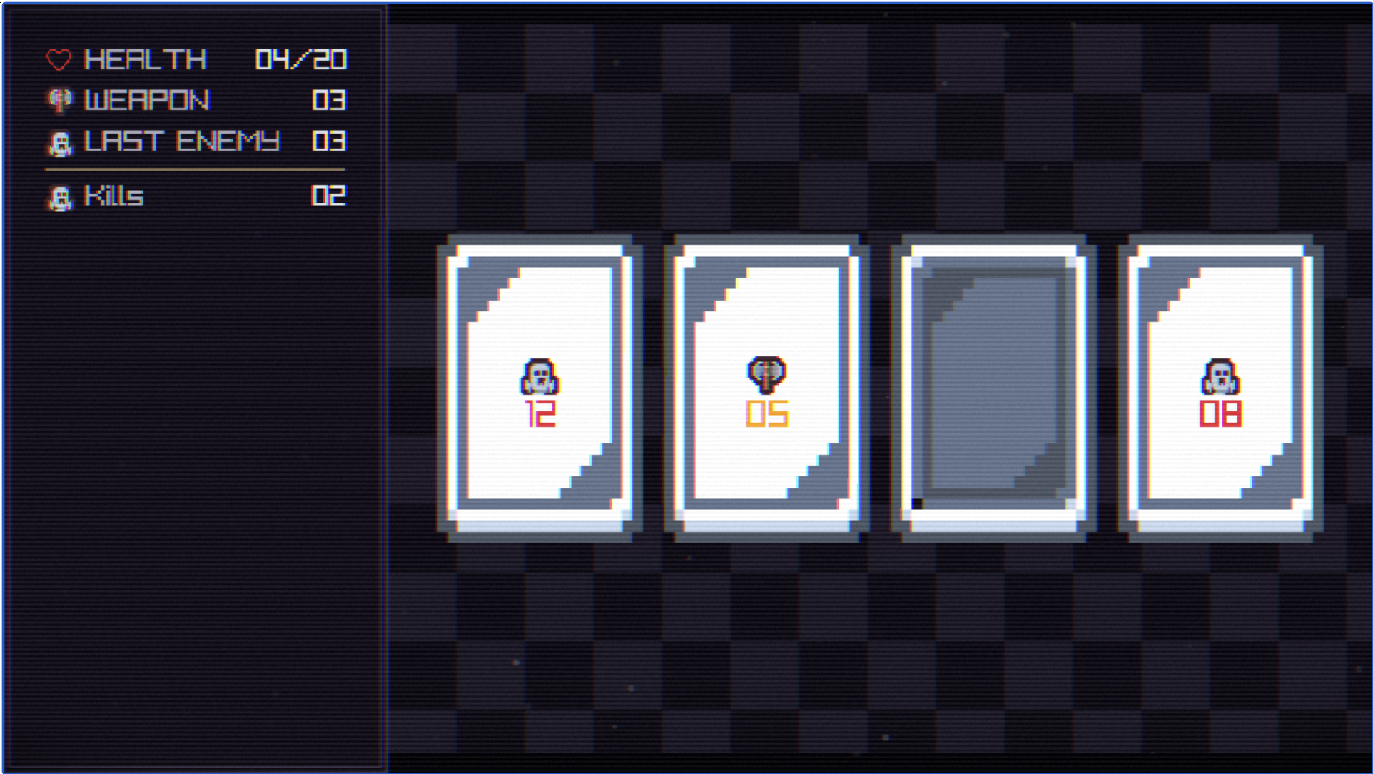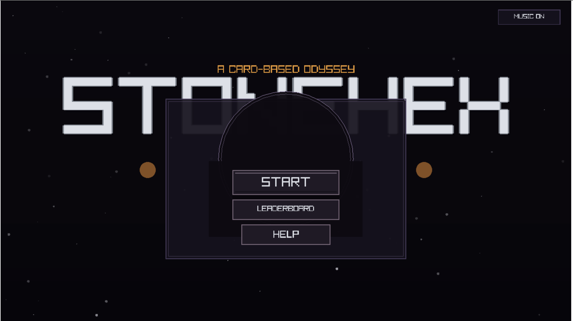 Stonehex is a small, card-driven roguelike focused on turn order and risk management. You clear rooms by resolving enemies, weapons, and potions in a chosen sequence, while difficulty ramps up over time. The game uses a minimal, arcade-style interface with simple animations, a starfield background, and a subtle CRT effect.